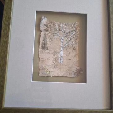 Framed Birch Bark painting illustrating two birch trees linked together midway